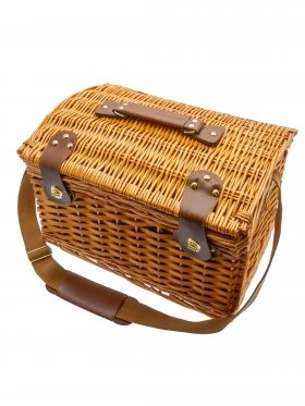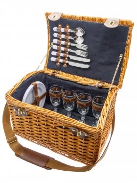 Traditional English picnic basket hand made from willow with curved lid and cotton linen lining. Provides full picnic service for four people. Includes: 4 melamine plates; 12 piece stainless steel cutlery set; 4 polycarbonate wine glasses. Dimensions closed: 40cm x 28cm x 26cm.