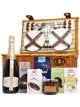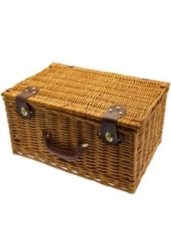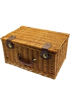 This traditional English picnic basket is hand made from willow with faux leather straps and cotton linen lining. Featuring full picnic service for 4 people, it includes 4 ceramic plates, 12 piece stainless steel cutlery set, 4 glass wine glasses and removable cooler bag. Dimensions closed: 46cm x 31cm x 24cm.