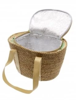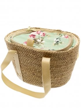 Woven seagrass basket with zippered canvas lid with an elegant floral design. 30cm x 21cm x 17cm.
