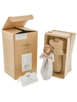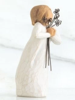 Willow Tree is an intimate, personal line of hand carved sculptures. Each represents a quality or sentiment that helps us feel close to others, heal wounds, or treasure relationships to living things. Expression is revealed through gestures only… a tilt of the head, placement of the hands, a turn of the body. Each piece is cast from the artist’s (Susan Lordi) original carving and then painted by hand. Susan says, “I try to keep the interpretation of Willow Tree open. I hope this makes it more personal, and allows the viewer to decide its meaning.”