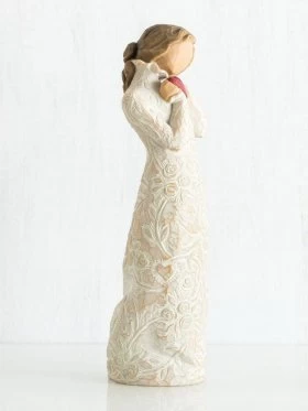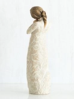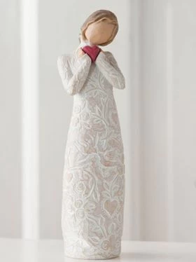Willow Tree is an intimate, personal line of hand carved sculptures. Each represents a quality or sentiment that helps us feel close to others, heal wounds, or treasure relationships to living things. Expression is revealed through gestures only… a tilt of the head, placement of the hands, a turn of the body. Each piece is cast from the artist’s (Susan Lordi) original carving and then painted by hand. Susan says, “I try to keep the interpretation of Willow Tree open. I hope this makes it more personal, and allows the viewer to decide its meaning.”