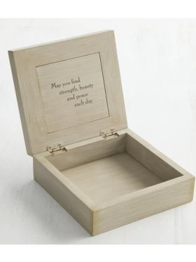 Finely crafted, hand-painted wood boxes with hinged lid. The sentiment is written on the underside of the lid, “May you find strength, beauty and peace each day”. Larger size is nice for jewellery, keys, notes, change.