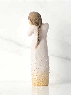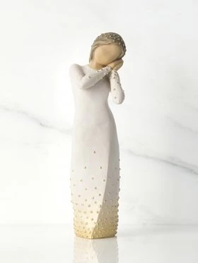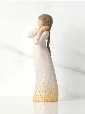 “This is a very open piece, in which the giver and receiver participate in defining its meaning. The giver can fill in the wish—perhaps a hopeful wish for a future aspiration, or a wistful ‘missing you’ wish, or a healing wish of comfort and friendship. At Christmas time, Wishing can be added to the Nativity display. Her golden halo and angelic gesture engage with the other figures to tell a story.” —Susan Lordi